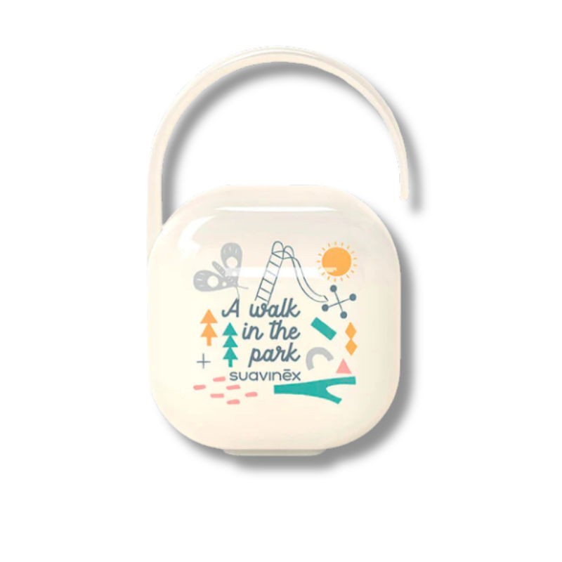 Suavinex portachupete clásico, es ideal para guardar y transportar los chupetes del bebé con asa para colgar el carro o en el bolso.