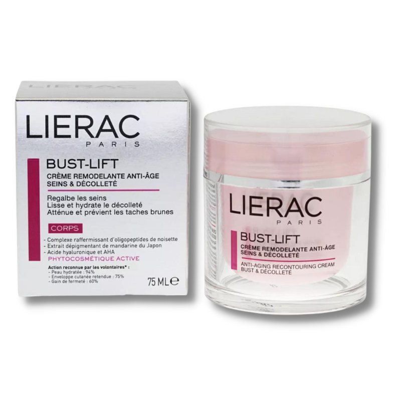 Lierac bust-lift crema 75 ml, es un tratamiento remodelante antiedad para busto y escote. Atenúa y previene las manchas, realza los senos y alisa e hidrata el escote.