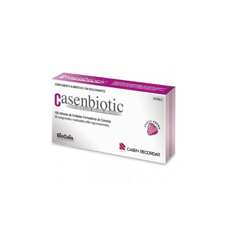 - Casenbiotic fresa 30 comprimidos, probiótico formulado a base de fermentos de lácto bacillus reuteri protectis.