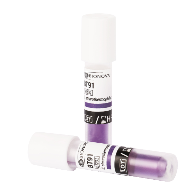 Esporas de Geoacillus Stearothermophilus, inoculadas en soporte sintético. Medio de cultivo de caldo de soja teñido con un indicador de pH. Tapón con filtro de lámina sintética barrera biológica efectiva, con indicador químico de proceso de Violeta a Verde.