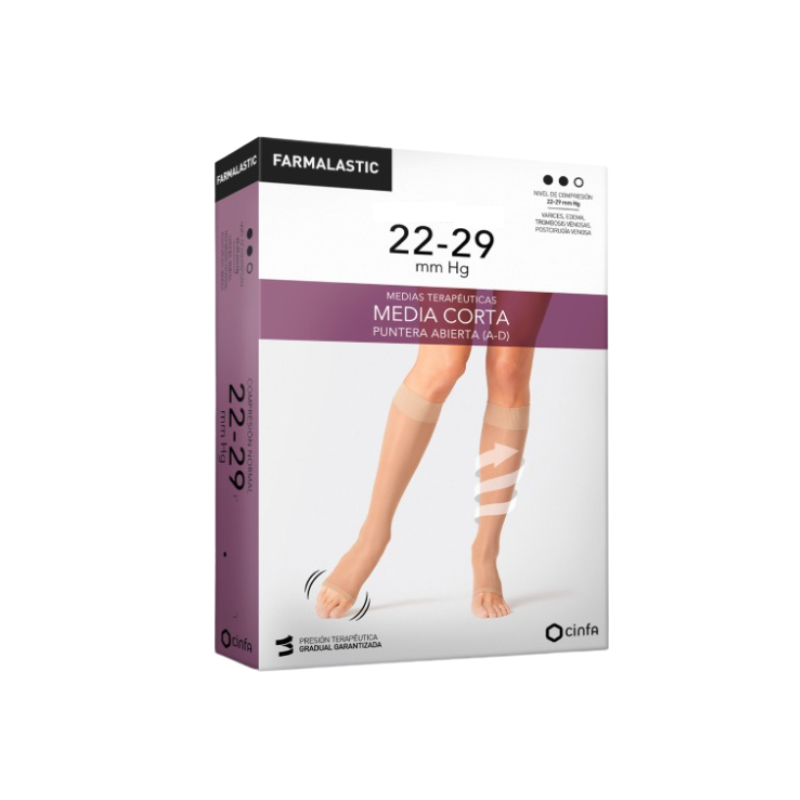 Farmalastic media corta (a-d) compresión fuerte puntera abierta talla mediana 1 ud es una media de compresión fuerte con puntera abierta que contribuye a mejorar la circulación.
