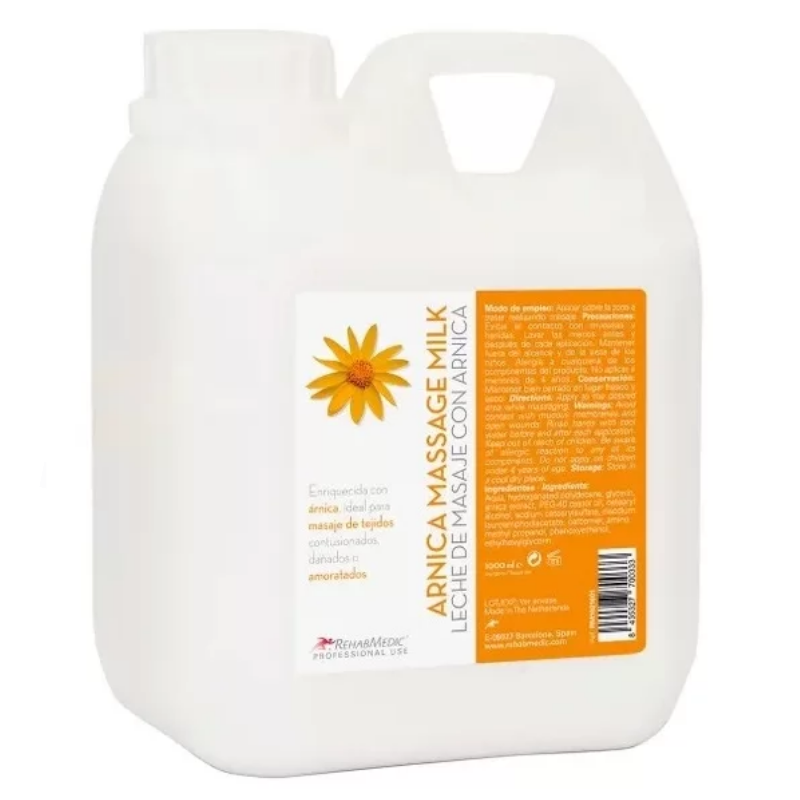 Árnica massage milk 1 litro, leche enriquecida con árnica, está indicada para masaje de tejidos contusionados, dañados o amoratados.