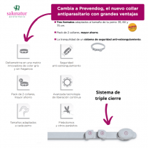 Dispone de un triple cierre regulable, y un tejido semi-elástico. El contacto ocasional del collar con el agua no le resta eficacia. Se recomienda retirarlo para bañar a la mascota.