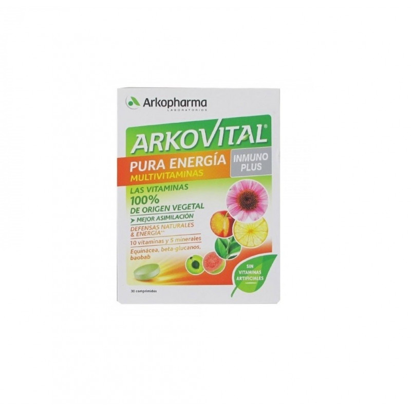 Arkovital pura energía multivitaminas 30 comprimidos es un multivitamínico que aporta vitaminas del grupo B, vitamina C, vitamina E y minerales indicado para aumentar tus defensas naturales y gozar de una dosis extra de vitalidad. Está elaborado con vitaminas 100% de origen natural y con certificado de cultivo orgánico, lo que mejora su asimilación.