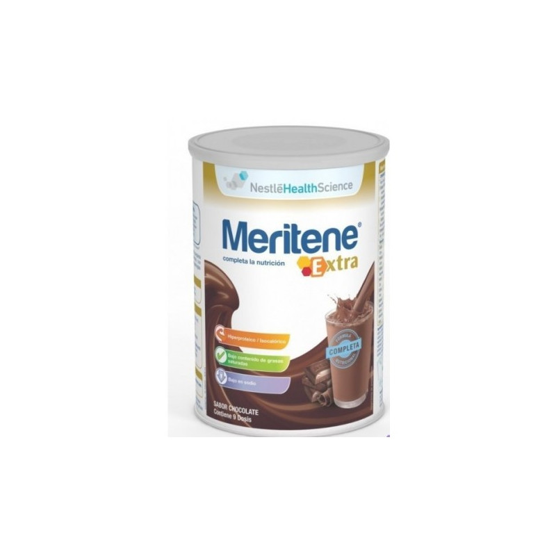 Meritene extra chocolate bote 450g complemento de nutrición para personas con problemas dietéticos graves que necesitan de requerimientos energéticos y/o proteicos aumentados y con patologías que conllevan desnutrición o riesgo de desnutrición.
