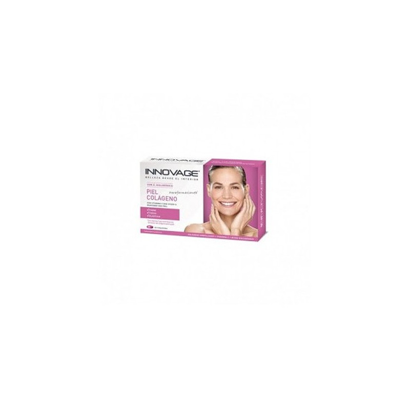 Innovage piel colágeno 45 comprimidos, ayuda a mantener una piel firme, tersa y elástica gracias a la vitamina C que contribuye a la formación normal del colágeno para el funcionamiento normal de la piel; el colágeno, una proteína que se encuentra naturalmente en la piel y es esencial para su estructura, y el ácido hialurónico.