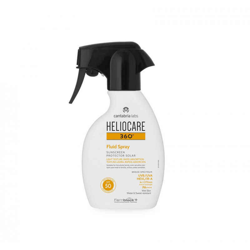HELIOCARE 360 FLUID PROTECTOR SOLAR SPRAY SPF50+ 250 ML, protección solar SPF50 corporal, de rápida absorción y que puede aplicarse sobre piel húmeda siendo resistente al agua y a la sudoración.